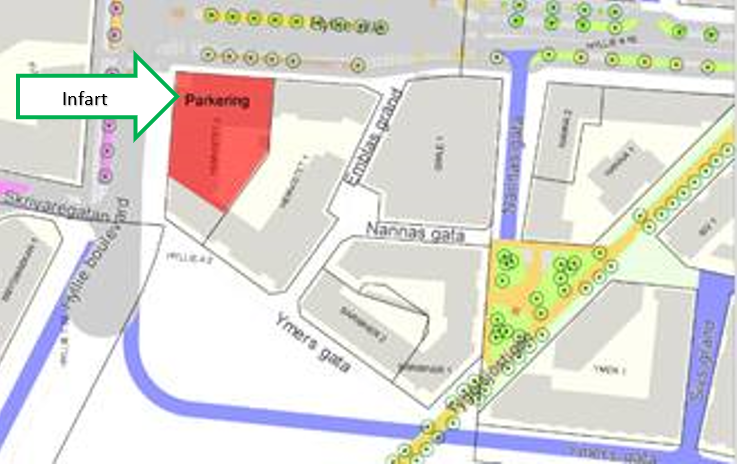 Garaget stängt under v.27 Hej, Malmö stad kommer att tillfälligt stänga av utfarten från Sivs gränd mot Ymers gata under vecka 27, den 29/6-3/7. Detta för att färdigställa gatan vilket tyvärr stänger av in- och utfart till garaget under den tiden. Så kom ihåg att flytta er bil redan kvällen innan den 28/6. För er som har parkering i garaget och behöver ha tillgång till er bil under dessa dagar finns ersättningsplatser på Peabs mark, se nedanstående bild där parkeringen är markerad med rött. För er som har cyklar i cykelrummet hänvisar vi er till att använda hissen under perioden. Ni kommer att få en kod till ett kodlås som ni behöver för att öppna grinden till parkeringen. Viktigt är också att låsa varje gång ni kör därifrån. Bonea (er ekonomiska förvaltare) kommer kontakta alla som har parkeringsavtal och ge er koden. Det gröna pilen i bilden ovan visar ungefärlig infart. Malmö stad är informerade om miljörummet på Sivs gränd och sophantering ska kunna hanteras som vanligt. För mer information om arbetet med gatorna och ersättningsparkeringen vänligen kontakta Malmö stad/Serneke: Malmö stad: Magnus Ahlcrona, 0709-34 13 60 Serneke: Robert Sepp, 0728-58 45 81
