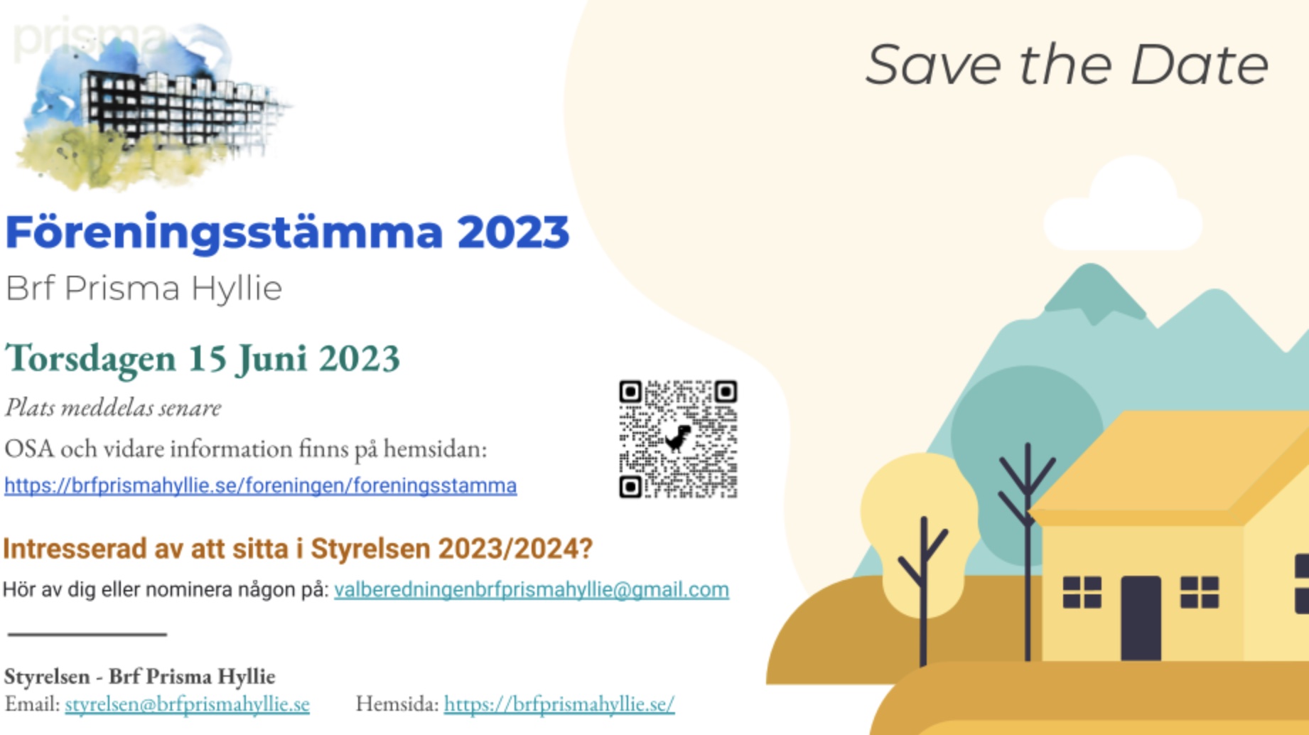Save the date - årsstämma 2023 Information till medlemmar i Brf Prisma Hyllie - Föreningsstämma och Intresseanmälan till styrelsearbete samt valberedning.Vi har tagit oss igenom ett år till - och det är nu dags för föreningsstämma för Brf Prisma Hyllie.Datum för föreningsstämman är nu bokad till den 15 juni, kl 19.00 som fysiskt möte - plats meddelas snart. En formell kallelse med bilagor kommer att skickas ut fysiskt och läggas upp på föreningens hemsida två veckor innan mötet. För bästa planering och förberedelser inför mötet IRL, ber vi er vänligen bekräfta om ni kommer närvara på mötet: Information och dokument: Se hemsidan https://www.brfprismahyllie.se/foreningen/foreningsstamma OSA till föreningsstämman: Via denna anmälningslänk. Är ni intresserade av att sitta i Styrelsen 2023/2024? Hör av er till: Valberedningen Brf Prisma Hyllie Föreningens stadgar finns här samt vidare föreningsstämma dokument/mallar eller information hittar ni här nedan. Vi ser fram emot att träffa er den 15 Juni 2023. Tveka inte att höra av er till Tack på förhand! Med vänliga hälsningar, Styrelsen -